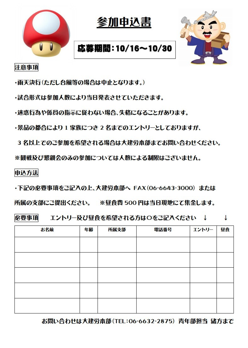 ●お問い合わせ・申し込み 大建労本部(TEL:06-6632-2875)青年部担当 緒方(おがた)