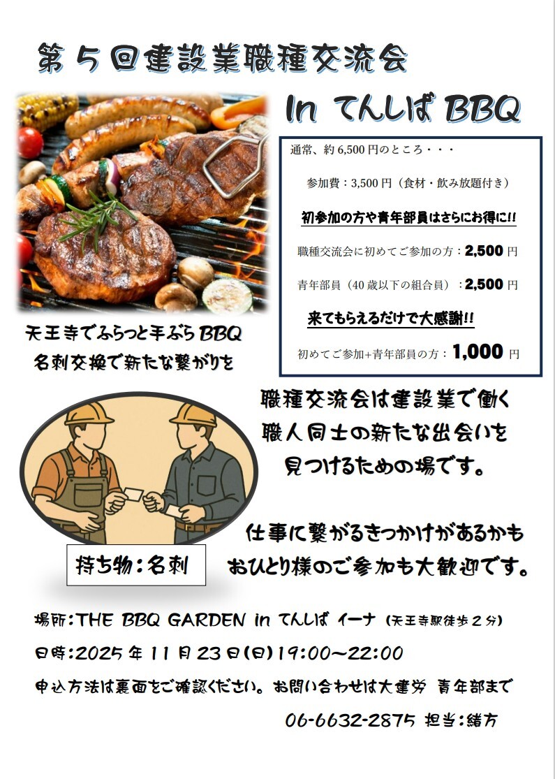 毎回好評をいただいております人気企画、職種交流会の第5回目の開催が決定しました! 📅11月23日(日)19:00~22:00 今回は天王寺のてんしばでのBBQとなります、食材・飲み放題付きです😊 初参加の方や青年部員(40歳以下の組合員)にはお得な割引もあります✨![]()